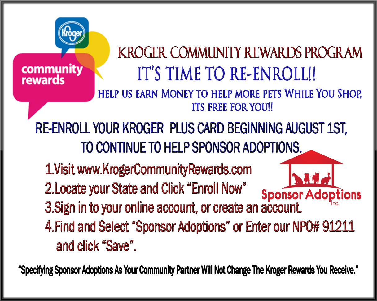 You will help us to start earning rewards for Sponsor Adoptions beginning August 1st using your Kroger Plus Card!