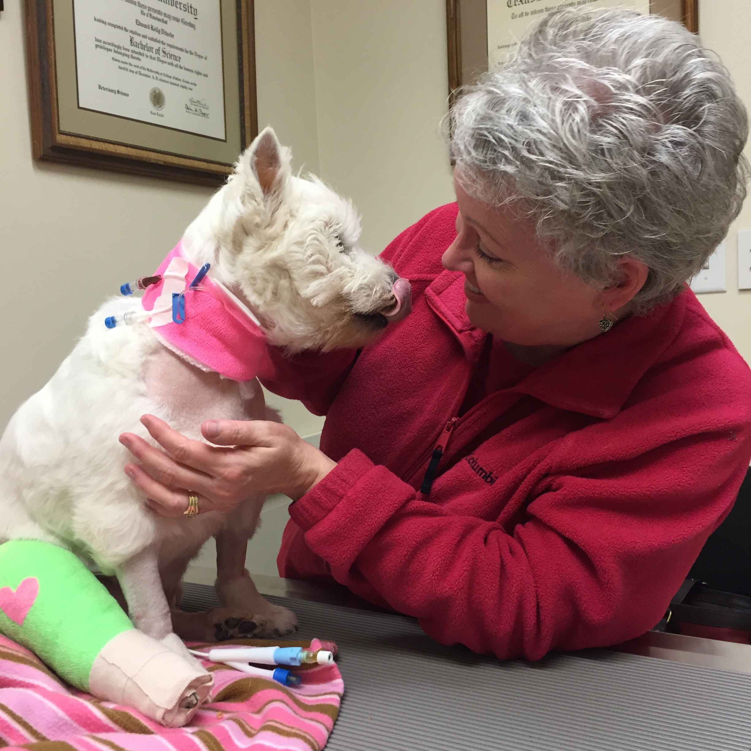 When we arrived in the room and Nicole his vet tech placed him on the table he quickly turned to look at his foster mom and he perked up. He was loved and held during our visit. He has not eaten since Monday night, but he took his first nibble today..he ate one chicken nugget….and when he took that first little nibble there were tears in the room! Since he ate the chicken nugget for his foster mom, the vet staff suggested we get him a rotisserie chicken so they could have it on hand to feed him throughout the day. The vet staff is taking such great care of him and really pulling together for him. His condition has not worsened nor improved (per the medical doctors) but his nurse said she could see him perking up a little and trying to move. The darken skin (infection) on his right leg has not spread and the skin appeared so much better than yesterday. The nurse agreed his leg looked a lot better than yesterday. So baby steps, are miracles for this little boy. LSWR staff and volunteers (“Payton’s Crew”) will be back again tomorrow to visit with him. Please put our little Chicken Nugget in your prayers that he may recover and lead and active Westie lifestyle.