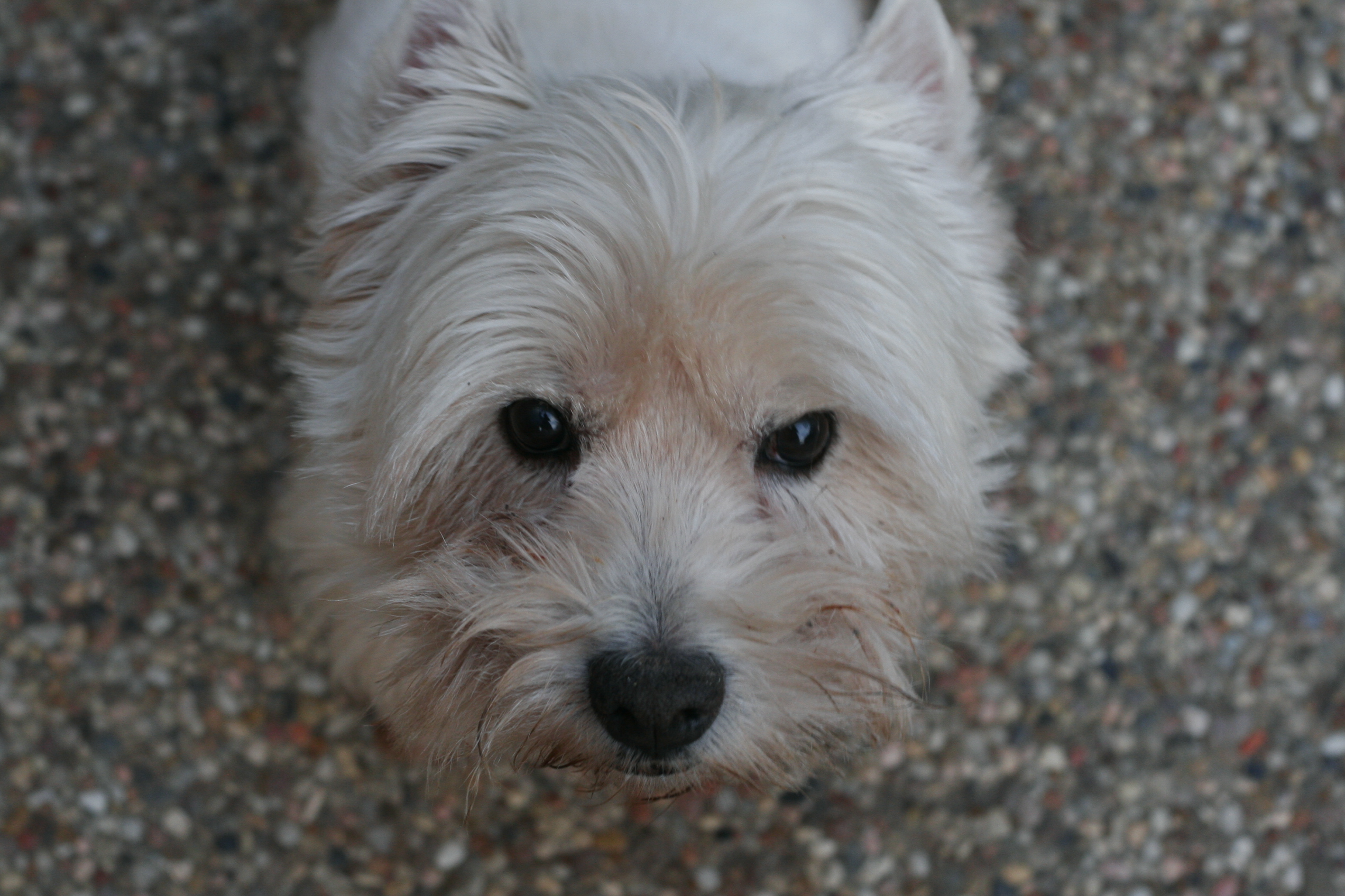 Now for the good part, me! I love to run, play, eat, and help my foster mom with gardening. I’m irresistible and if you don’t think so, I’ll sit up on my hind quarters waving my paws to make sure you are not missing any cuteness. When the door opens to go out I’m first in line and second to the last one in. I thought I was a good swimmer, but I over estimated my abilities. It’s so hard to be humble when you have so much going for you. I could go on about me, but I’d like to tell you about my older brother, Boomer. He’s a laid back Westie and loves….well me! He likes his belly rubbed, exploring the backyard, food and again me. He too sits on his hind quarters for dinner and treats, but hasn’t perfected the “paw waving” technique that I have mastered. He’s a bit hard of seeing and uses me as a guide in new places. Once he has the lay of the land there is no stopping him.